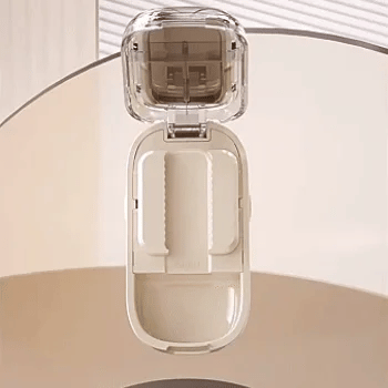 Nuestro cortador de pastillas puede partir varias pastillas por la mitad o en cuatro a la vez, ahorrando tiempo y esfuerzo. El compartimento inferior ofrece espacio adicional para la medicación, ideal para llevar en el bolso o la mochila.